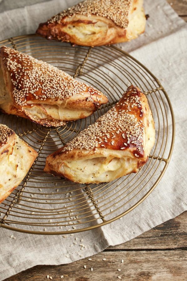 בצק עלים במילוי גבינות (ריקוטה, פטה, מוצרלה). מעוטר בשומשום